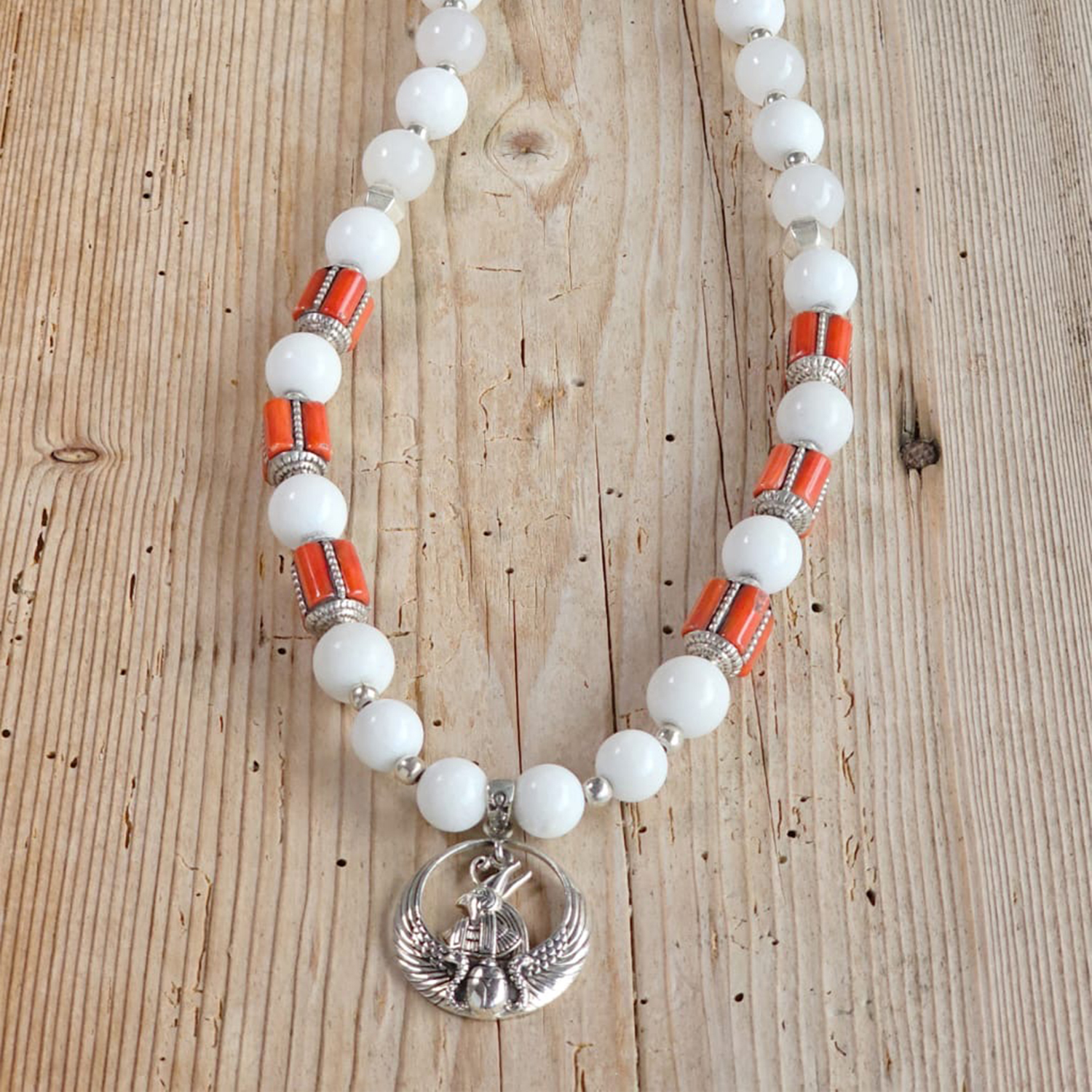 Setze ein elegantes Statement mit dieser zeitlosen Kette – einer harmonischen Kombination aus weißer Jade und in 925 Silber gefasster Koralle. Die ca. 1 cm großen Steine verleihen dem Schmuckstück eine feine Präsenz und strahlen Leichtigkeit, Ruhe und natürliche Eleganz aus.