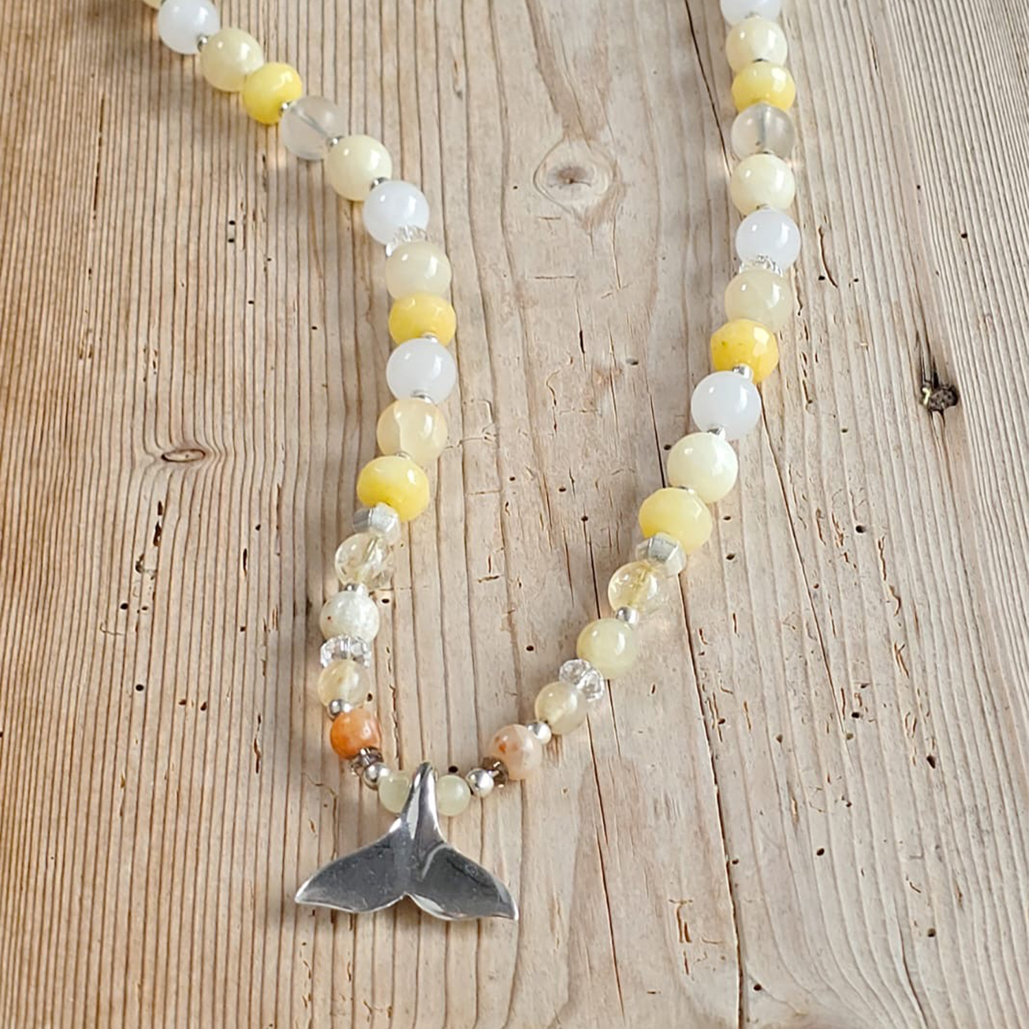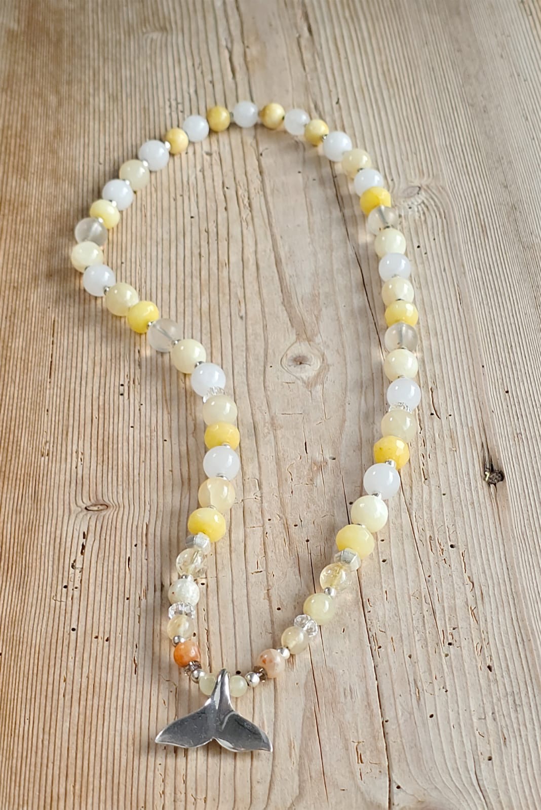 Setze ein Statement voller Leichtigkeit mit dieser besonderen Kette – einer strahlenden Kombination aus echten Edelsteinen aus Citrin und weißer Jade sowie feinen Elementen aus 925 Sterling Silber. Die hellen Natursteine schimmern sanft im Licht und erinnern an warme Sommertage, Salzwasser auf der Haut und endlose Sonnenuntergänge am Meer.